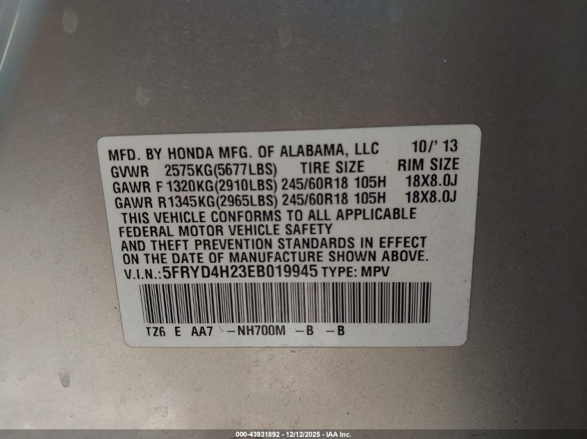 Колір СрібнийЦиліндри 6Привід Повний привідVIN 5FRYD4H23EB019945Стан Заводиться та їде (перевірено)Ушкодження Передня або задня AutoRIA