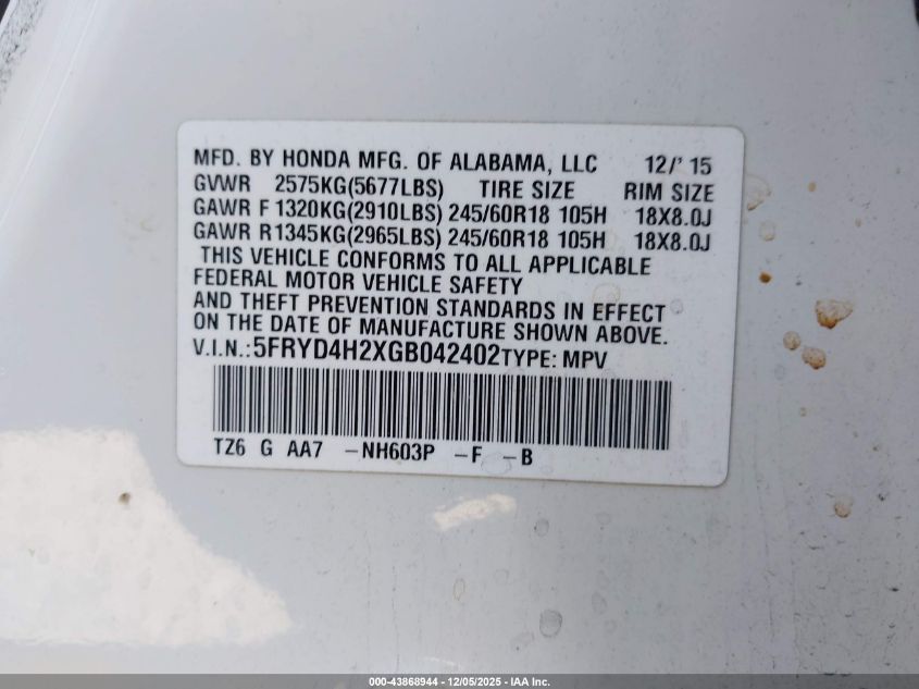 Колір БілийЦиліндри 6Привід Повний привідVIN 5FRYD4H2XGB042402Стан СтаціонарноУшкодження Передня ліва AutoRIA