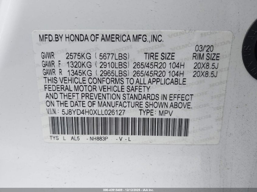 2020 ACURA MDX 2020 року Бензин, 3.5, Повний привід, vin - 5J8YD4H0XLL026127 з США