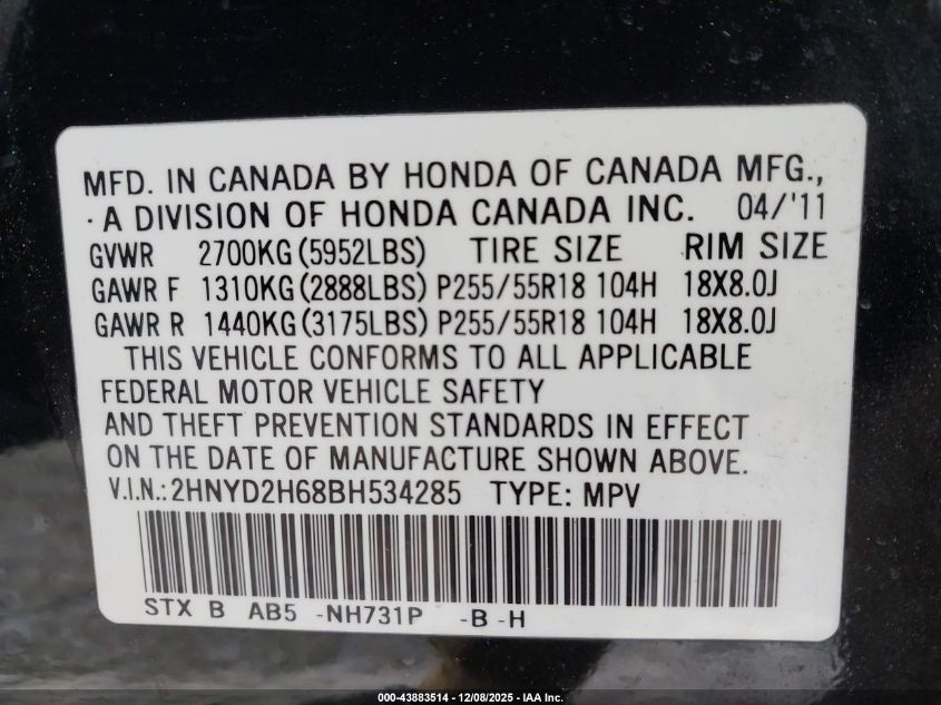 Колір ЧорнийЦиліндри 6Привід Повний привідVIN 2HNYD2H68BH534285Стан Заводиться та їде (перевірено)Ушкодження Задня AutoRIA