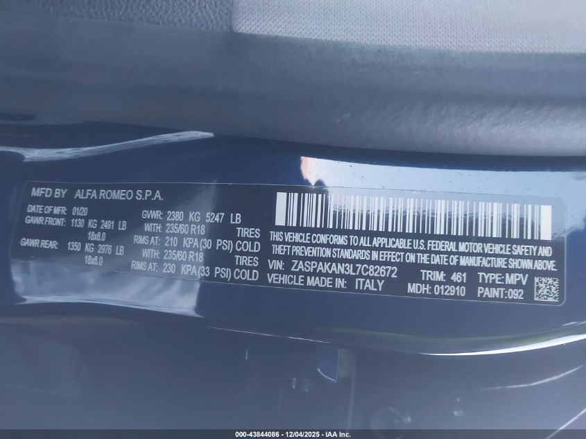 2020 ALFA ROMEO STELVIO 2020 року Бензин, 2.0, Повний привід, vin - ZASPAKAN3L7C82672 з США