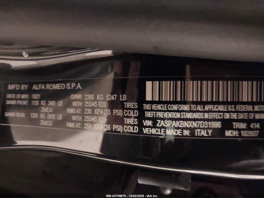 2022 ALFA ROMEO STELVIO 2022 року Бензин, 2.0, Повний привід, vin - ZASPAKBNXN7D31996 з США