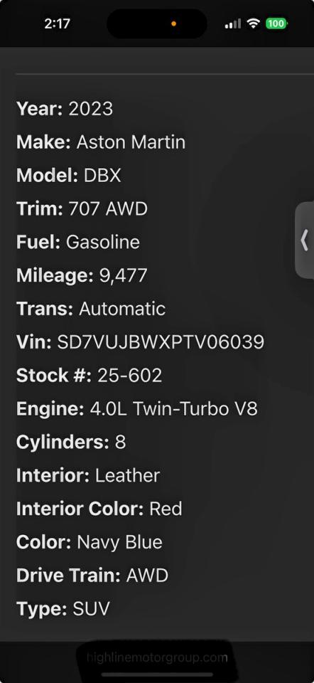 2023 ASTON MARTIN DBX 2023 року Бензин, 4.0, Повний привід, vin - SD7VUJBWXPTV06039 з США