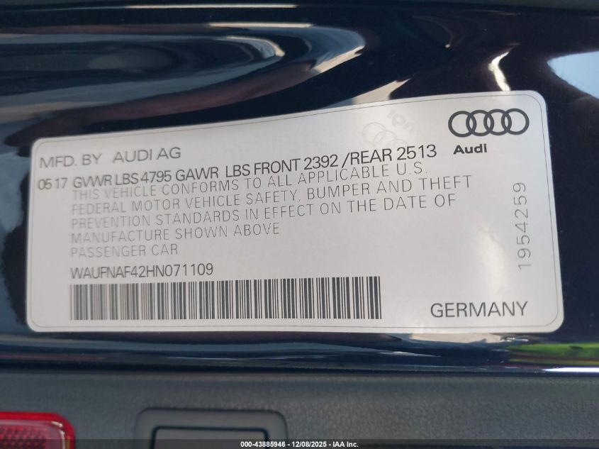 2017 AUDI A4 2017 року Бензин, 2.0, Повний привід, vin - WAUFNAF42HN071109 з США