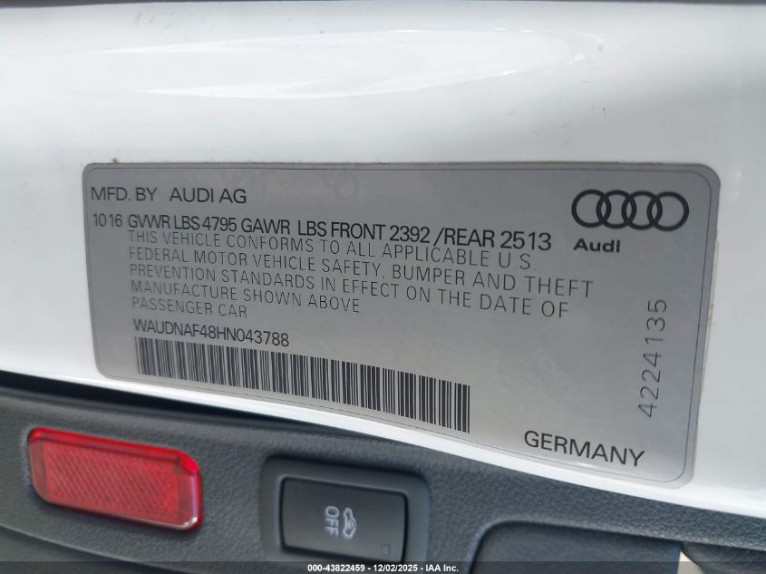 2017 AUDI A4 2017 року Бензин, 2.0, Повний привід, vin - WAUDNAF48HN043788 з США