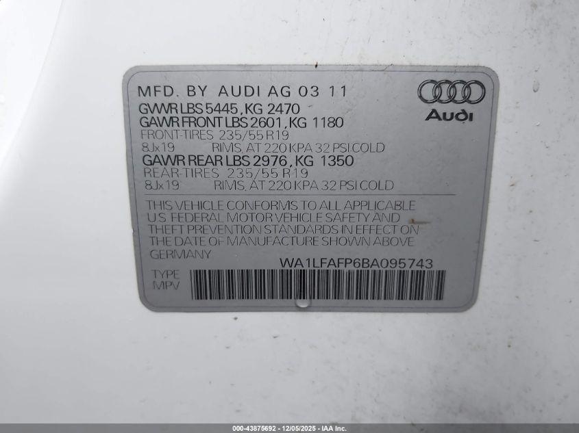 2011 AUDI Q5 2011 року Бензин, 2.0, Повний привід, vin - WA1LFAFP6BA095743 з США