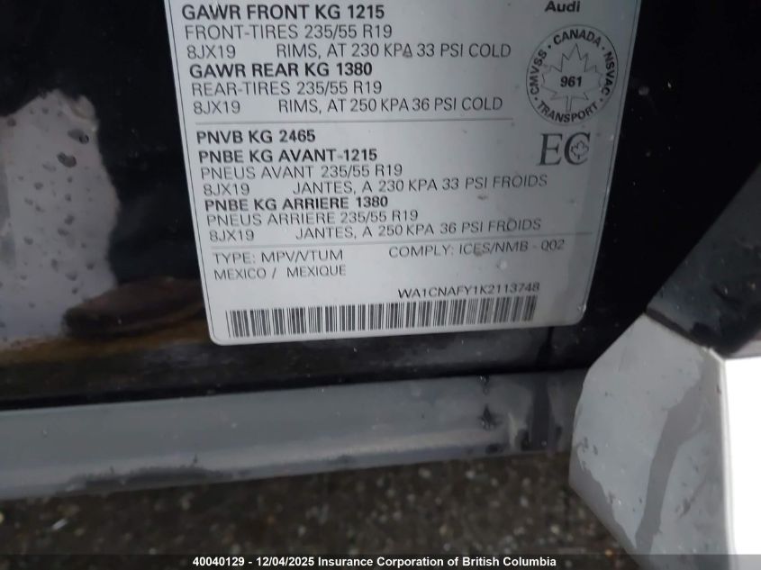 Колір ЧорнийЦиліндри 4Привід Повний привідVIN WA1CNAFY1K2113748Стан Заводиться та їде (перевірено)Ушкодження ПередняДата аукціону 2025-12-08 AutoRIA