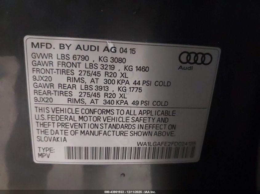 2015 AUDI Q7 2015 року Бензин, 3.0, Повний привід, vin - WA1LGAFE2FD024135 з США