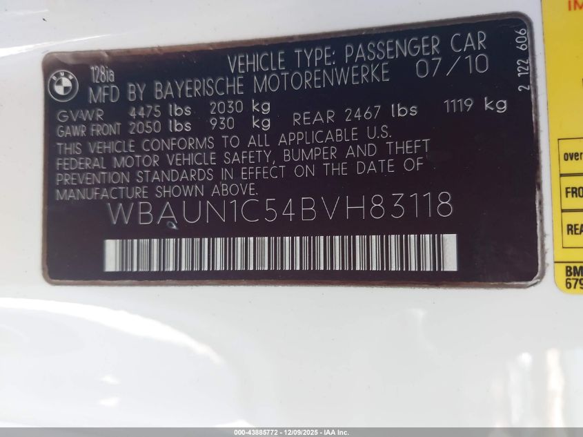2011 BMW 1 SERIES 2011 року Бензин, 3.0, Задній привід, vin - WBAUN1C54BVH83118 з США
