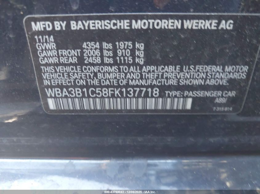 2015 BMW 3 SERIES 2015 року Бензин, 2.0, Задній привід, vin - WBA3B1C58FK137718 з США
