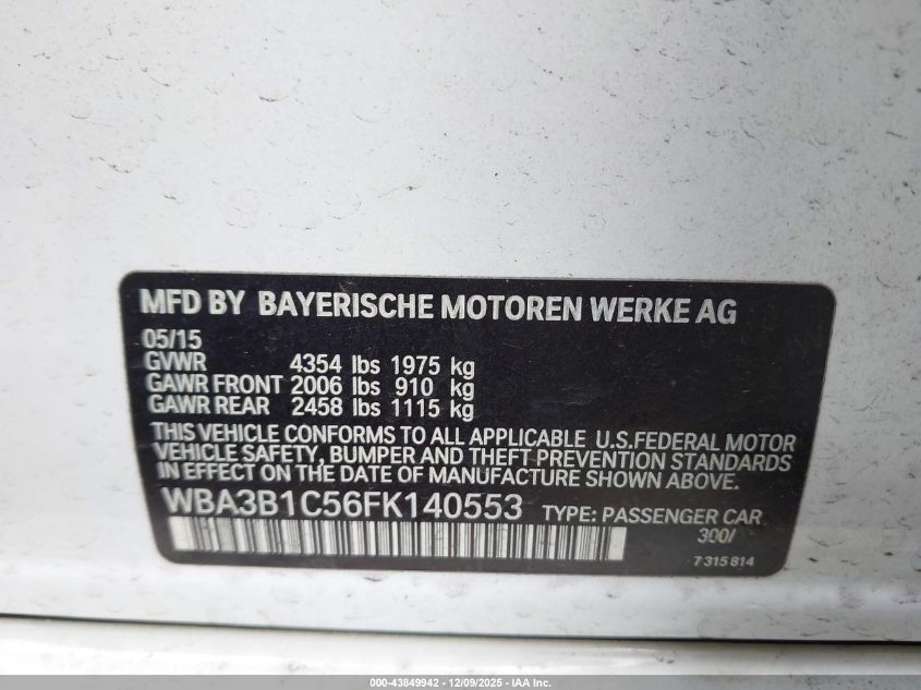 2015 BMW 3 SERIES 2015 року Бензин, 2.0, Задній привід, vin - WBA3B1C56FK140553 з США