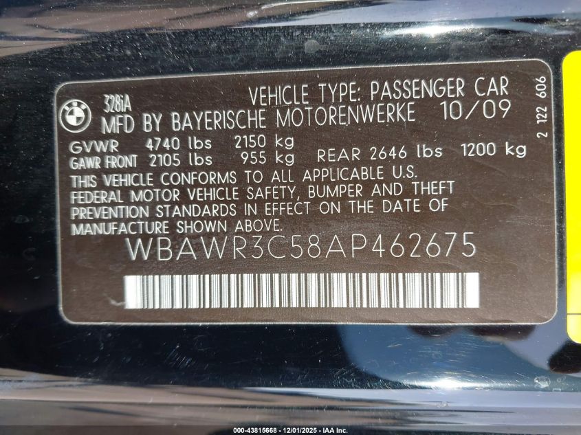 2010 BMW 3 SERIES 2010 року Бензин, 3.0, Задній привід, vin - WBAWR3C58AP462675 з США