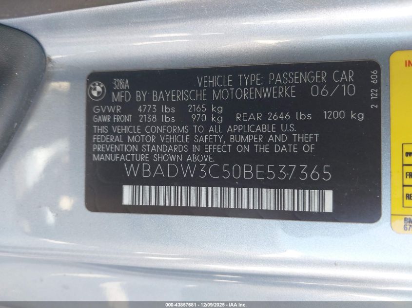 2011 BMW 3 SERIES 2011 року Бензин, 3.0, Задній привід, vin - WBADW3C50BE537365 з США
