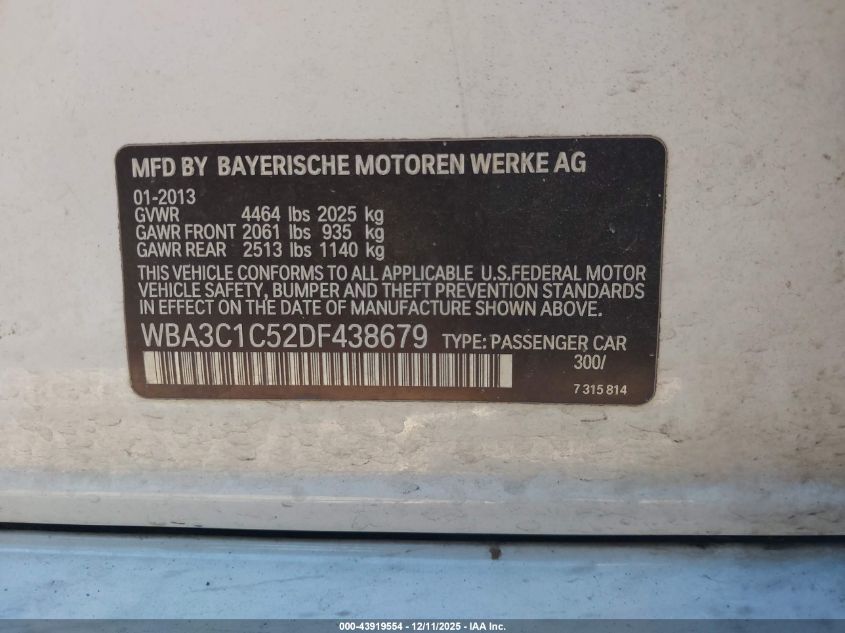 2013 BMW 3 SERIES 2013 року Бензин, 2.0, Задній привід, vin - WBA3C1C52DF438679 з США