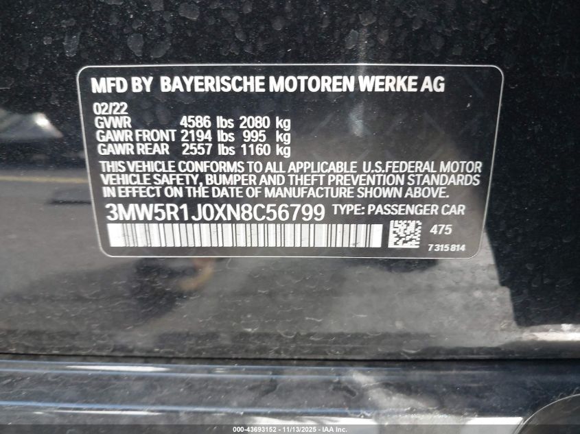 2022 BMW 3 SERIES 2022 року Бензин, 2.0, Задній привід, vin - 3MW5R1J0XN8C56799 з США