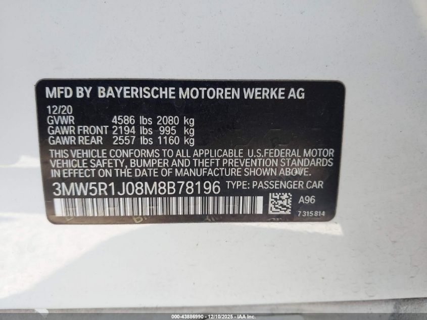 2021 BMW 3 SERIES 2021 року Бензин, 2.0, Задній привід, vin - 3MW5R1J08M8B78196 з США