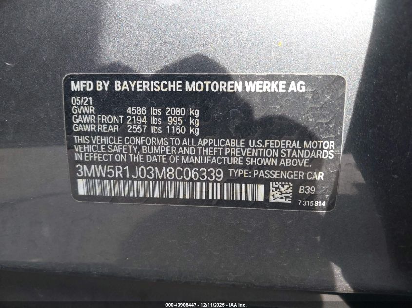 2021 BMW 3 SERIES 2021 року Бензин, 2.0, Задній привід, vin - 3MW5R1J03M8C06339 з США