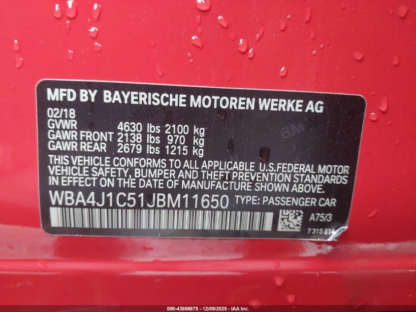 2018 BMW 4 SERIES 2018 року Бензин, 2.0, Задній привід, vin - WBA4J1C51JBM11650 з США