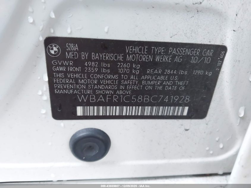 2011 BMW 5 SERIES 2011 року Бензин, 3.0, Задній привід, vin - WBAFR1C58BC741928 з США