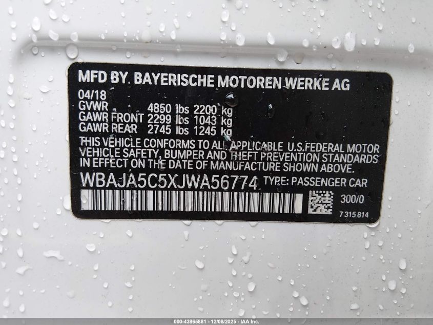 2018 BMW 5 SERIES 2018 року Бензин, 2.0, Задній привід, vin - WBAJA5C5XJWA56774 з США
