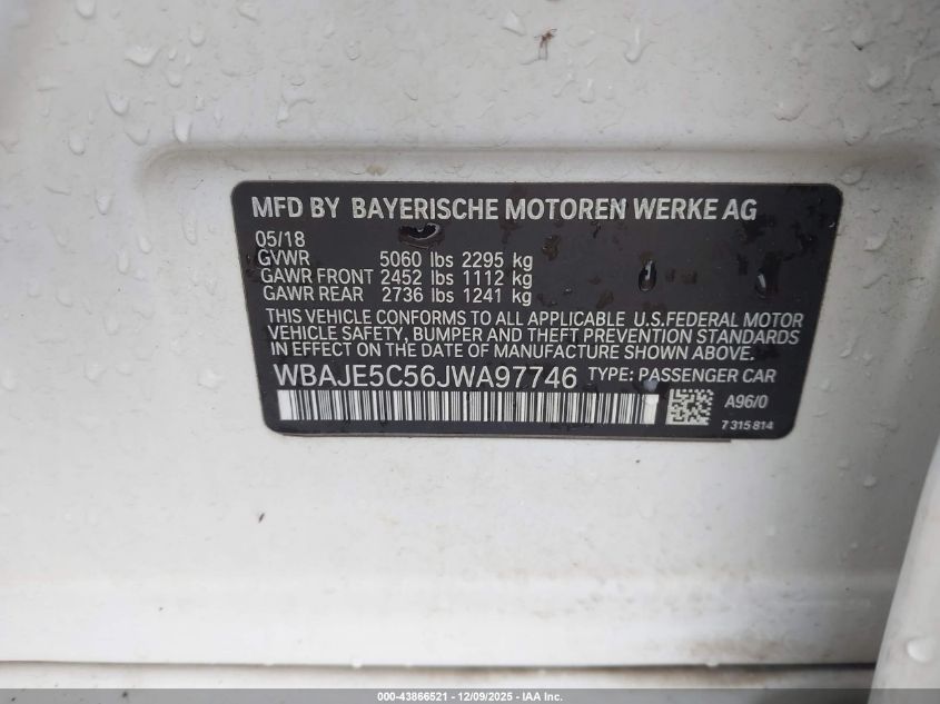 2018 BMW 5 SERIES 2018 року Бензин, 3.0, Задній привід, vin - WBAJE5C56JWA97746 з США