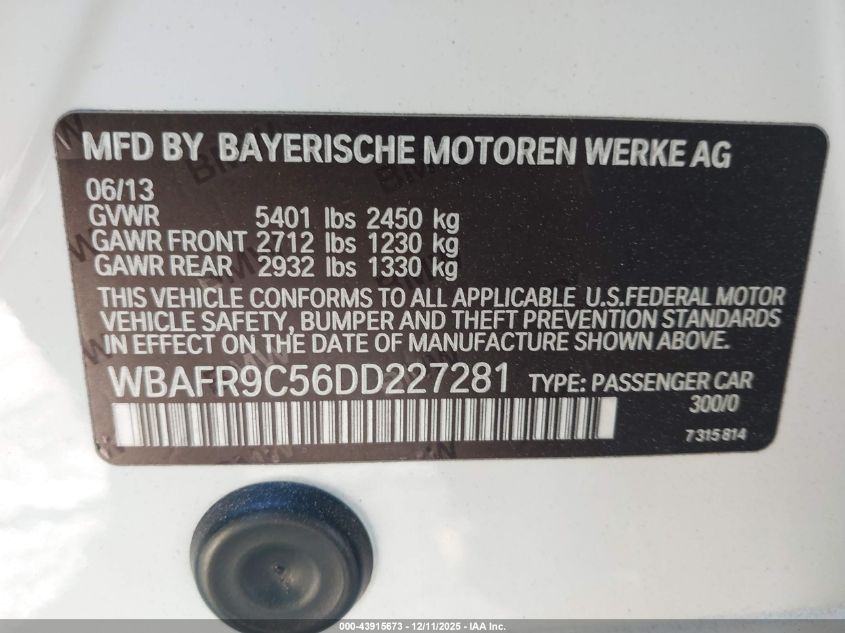 2013 BMW 5 SERIES 2013 року Бензин, 4.4, Задній привід, vin - WBAFR9C56DD227281 з США
