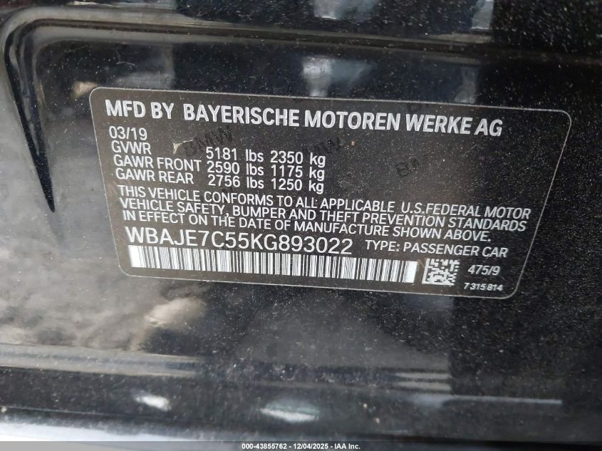 2019 BMW 5 SERIES 2019 року Бензин, 3.0, Повний привід, vin - WBAJE7C55KG893022 з США