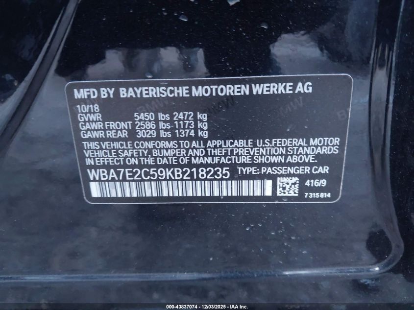 2019 BMW 7 SERIES 2019 року Бензин, 3.0, Задній привід, vin - WBA7E2C59KB218235 з США