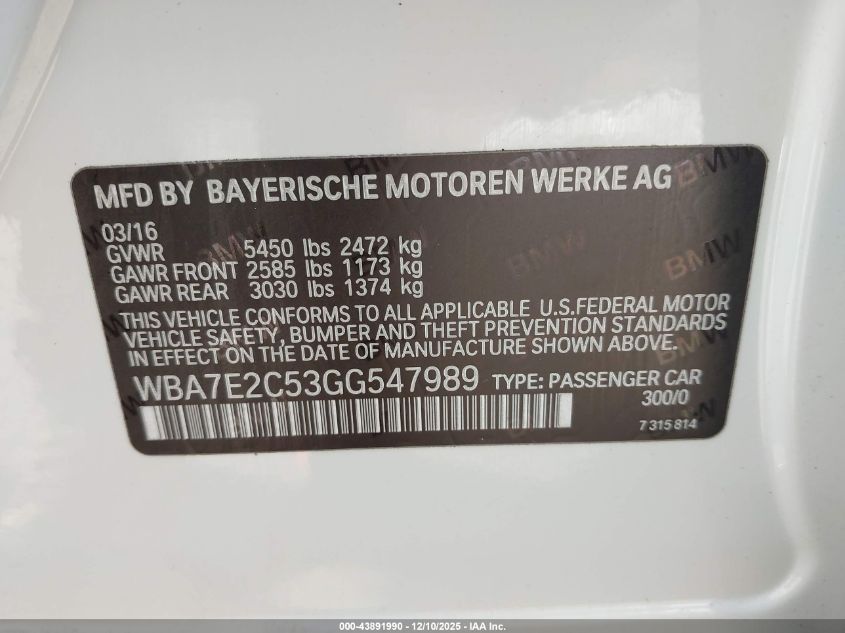 2016 BMW 7 SERIES 2016 року Бензин, 3.0, Задній привід, vin - WBA7E2C53GG547989 з США