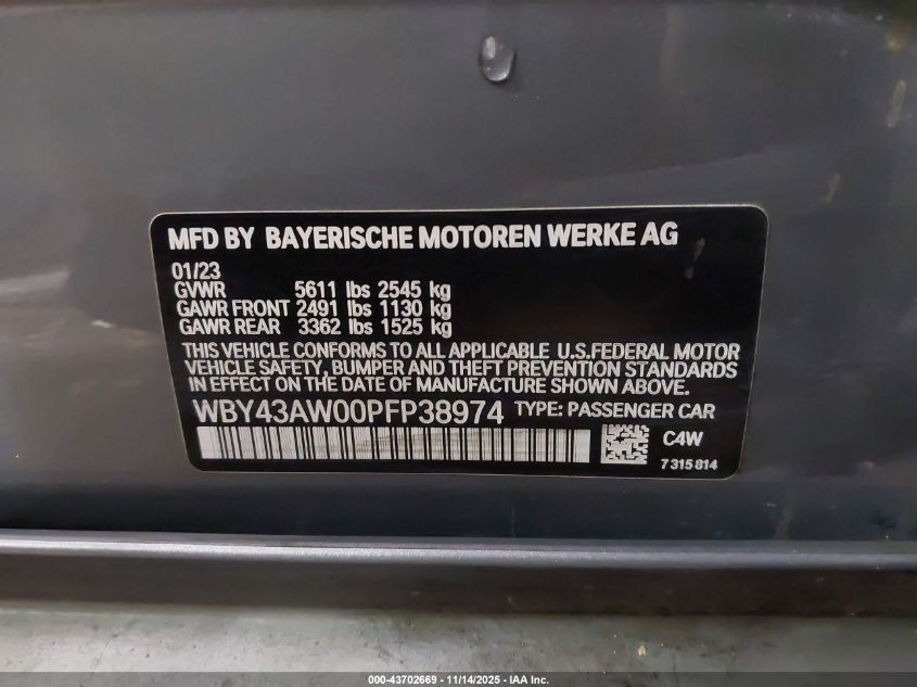 Колір СірийПривід Задній привідVIN WBY43AW00PFP38974Стан Заводиться та їде (перевірено)Ушкодження Ліва сторонаДата аукціону 2025-12-11 AutoRIA
