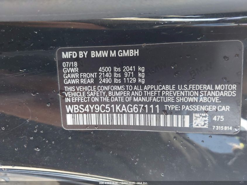 2019 BMW M4 2019 року Бензин, 3.0, Задній привід, vin - WBS4Y9C51KAG67111 з США