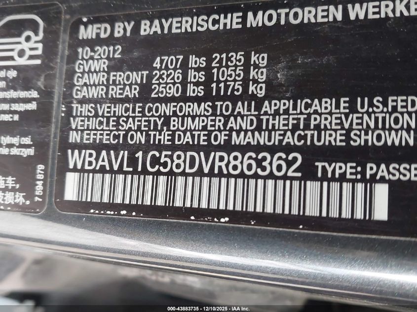 Колір СинійЦиліндри 4Привід Повний привідVIN WBAVL1C58DVR86362Стан СтаціонарноУшкодження Передня або задня AutoRIA