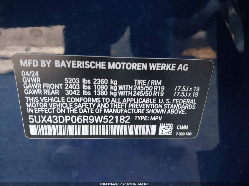 2024 BMW X3 2024 року Бензин, 2.0, , vin - 5UX43DP06R9W52182 з США