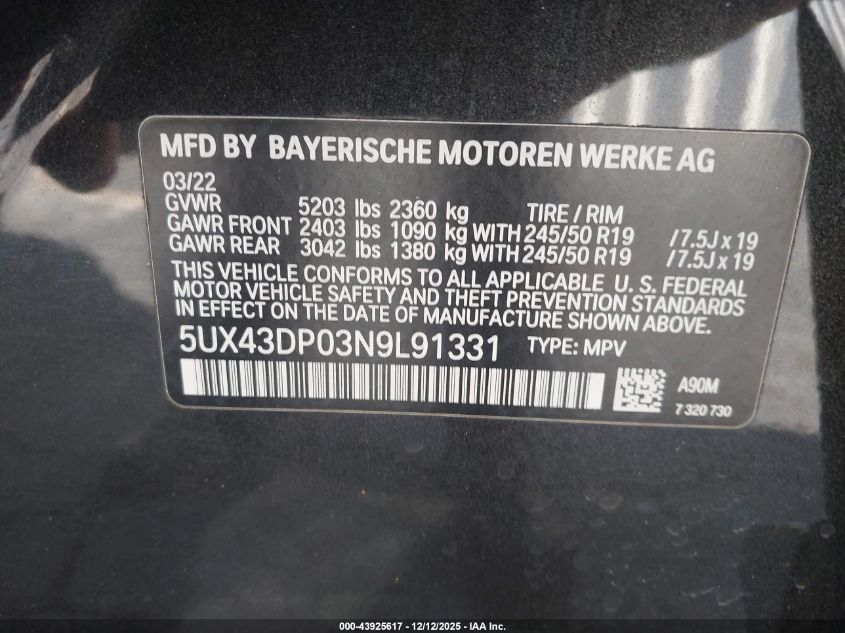 2022 BMW X3 2022 року Бензин, 2.0, , vin - 5UX43DP03N9L91331 з США
