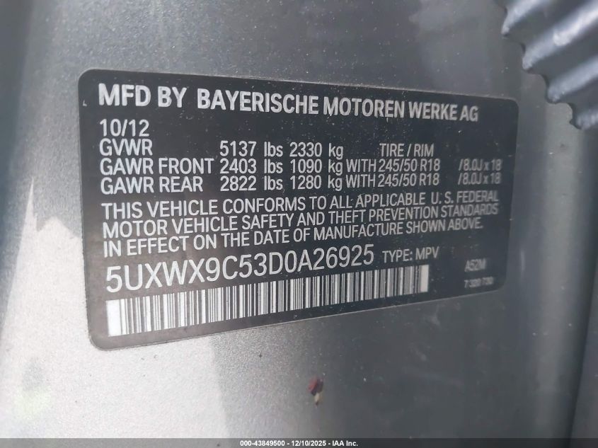 2013 BMW X3 2013 року Бензин, 2.0, Повний привід, vin - 5UXWX9C53D0A26925 з США