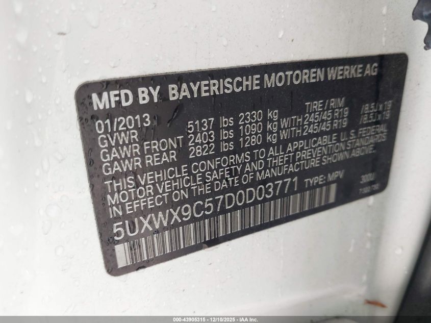 Колір БілийЦиліндри 4Привід Повний привідVIN 5UXWX9C57D0D03771Стан СтаціонарноУшкодження Ліва сторона AutoRIA