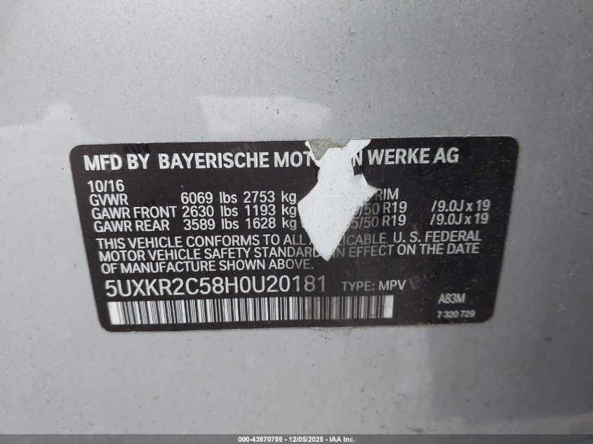 Колір СрібнийЦиліндри 6VIN 5UXKR2C58H0U20181Стан СтаціонарноУшкодження Передня або задня AutoRIA