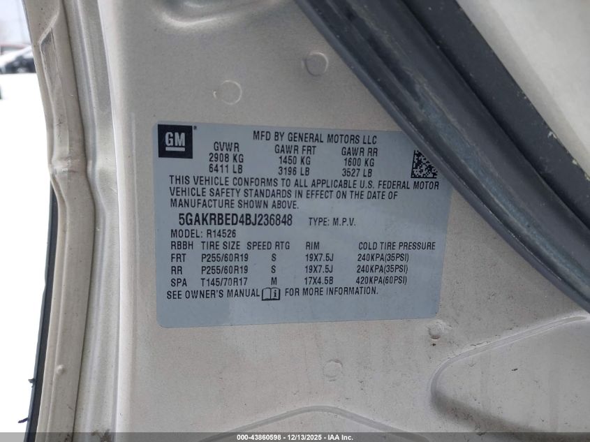 Колір ЗолотийЦиліндри 6Привід Передній привідVIN 5GAKRBED4BJ236848Стан НевідомоУшкодження Звичайний знос