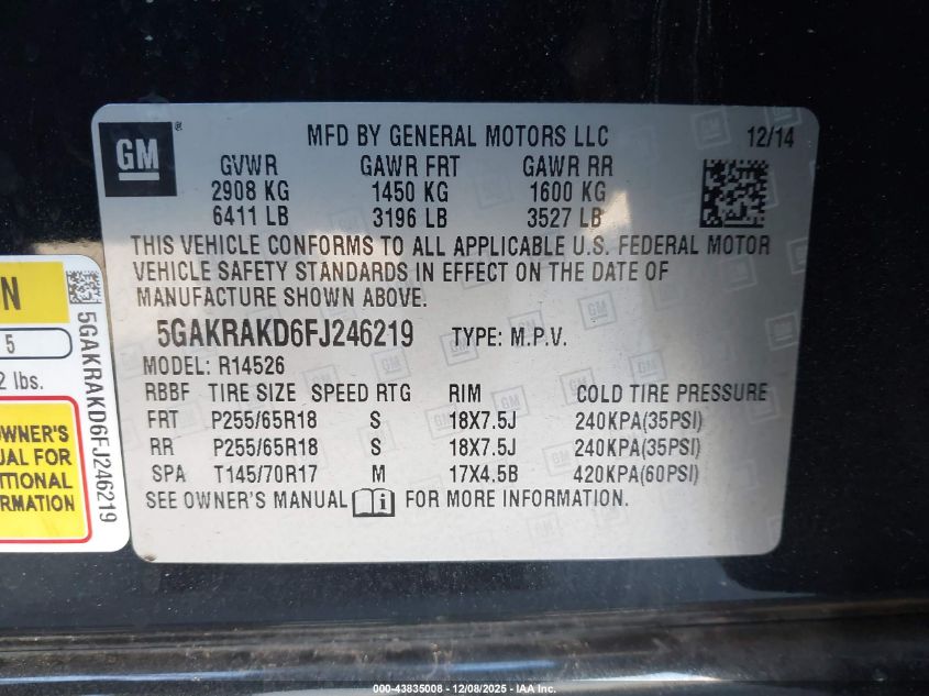 2015 BUICK ENCLAVE 2015 року Бензин, 3.6, Передній привід, vin - 5GAKRAKD6FJ246219 з США