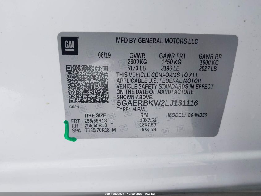 2020 BUICK ENCLAVE 2020 року Бензин, 3.6, Передній привід, vin - 5GAERBKW2LJ131116 з США