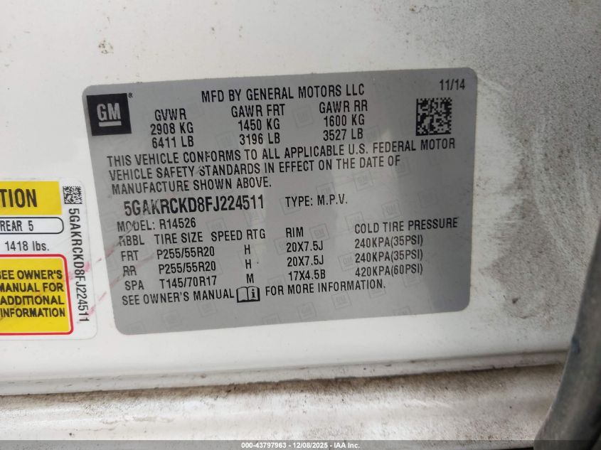 2015 BUICK ENCLAVE 2015 року Бензин, 3.6, Передній привід, vin - 5GAKRCKD8FJ224511 з США