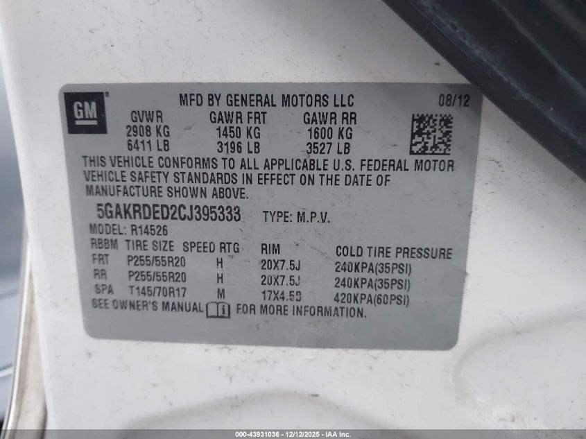 2012 BUICK ENCLAVE 2012 року Бензин, 3.6, Передній привід, vin - 5GAKRDED2CJ395333 з США