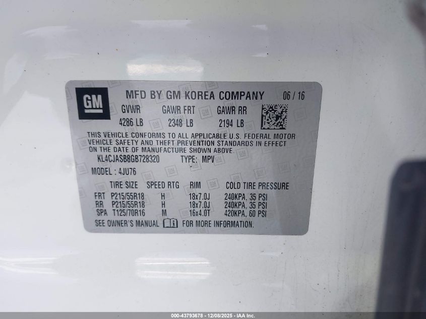 Колір БілийЦиліндри 4Привід Передній привідVIN KL4CJASB8GB728320Стан Заводиться та їде (перевірено)Ушкодження Права сторона AutoRIA