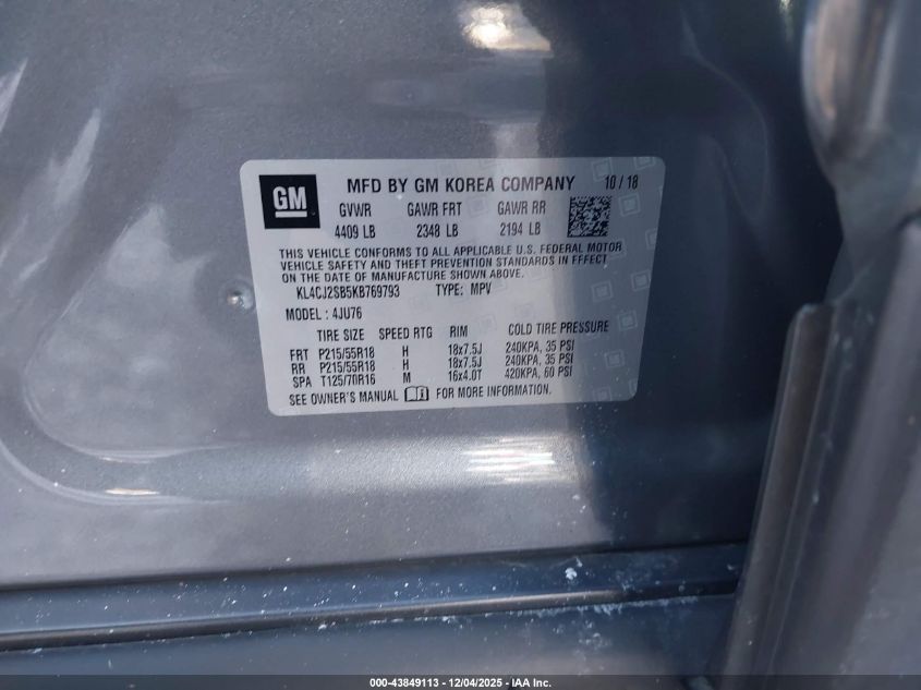 Колір СірийЦиліндри 4Привід Повний привідVIN KL4CJ2SB5KB769793Стан Заводиться та їде (перевірено)Ушкодження Незначні AutoRIA