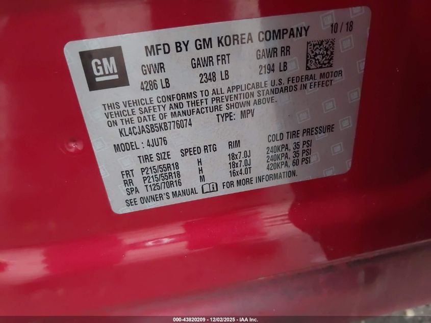 2019 BUICK ENCORE 2019 року Бензин, 1.4, Передній привід, vin - KL4CJASB5KB776074 з США