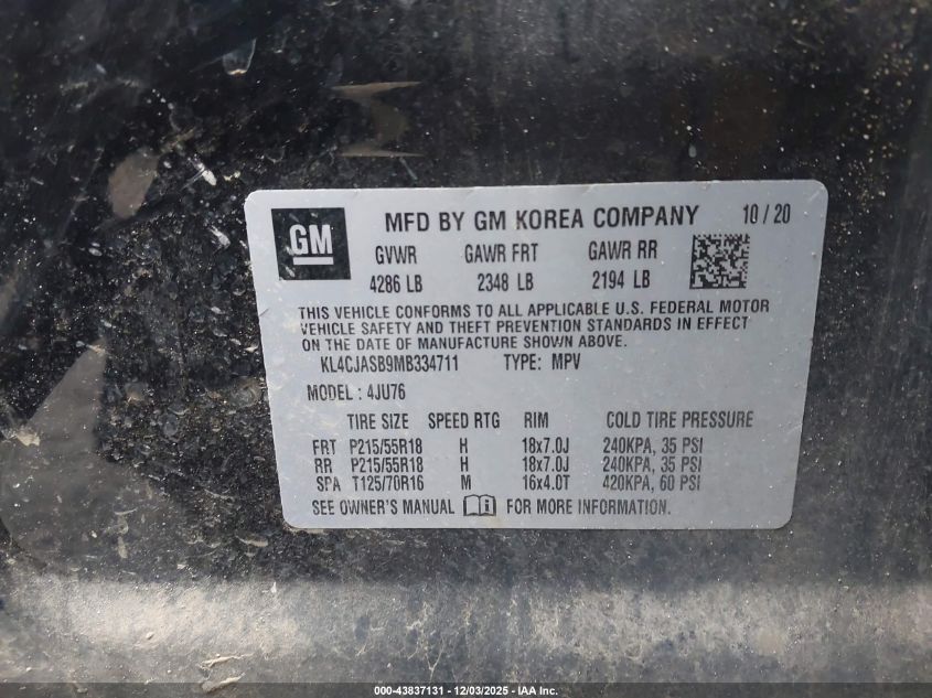 Колір СірийЦиліндри 4Привід Передній привідVIN KL4CJASB9MB334711Стан СтаціонарноУшкодження Ліва сторона AutoRIA