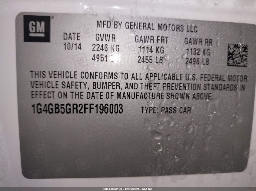 2015 BUICK LACROSSE 2015 року Бензин, 2.4, Передній привід, vin - 1G4GB5GR2FF196003 з США