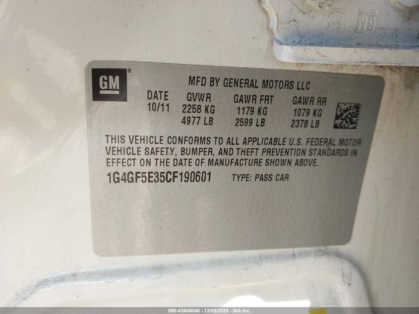2012 BUICK LACROSSE 2012 року Бензин, 3.6, Передній привід, vin - 1G4GF5E35CF190601 з США