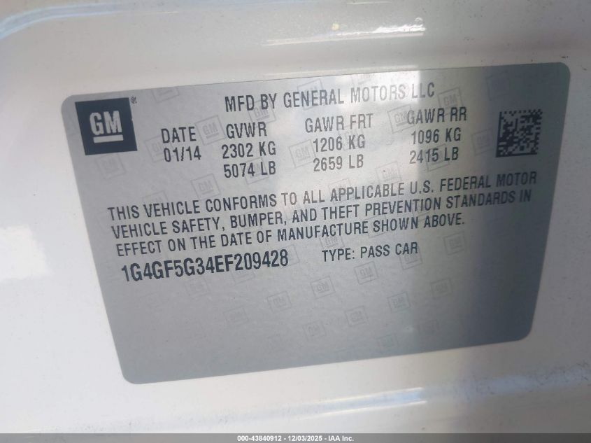 2014 BUICK LACROSSE 2014 року Бензин, 3.6, Передній привід, vin - 1G4GF5G34EF209428 з США