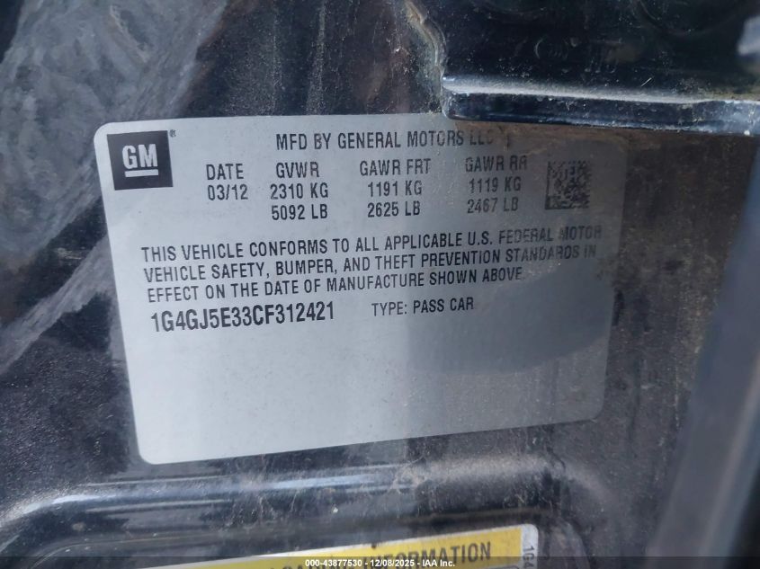 2012 BUICK LACROSSE 2012 року Бензин, 3.6, Передній привід, vin - 1G4GJ5E33CF312421 з США